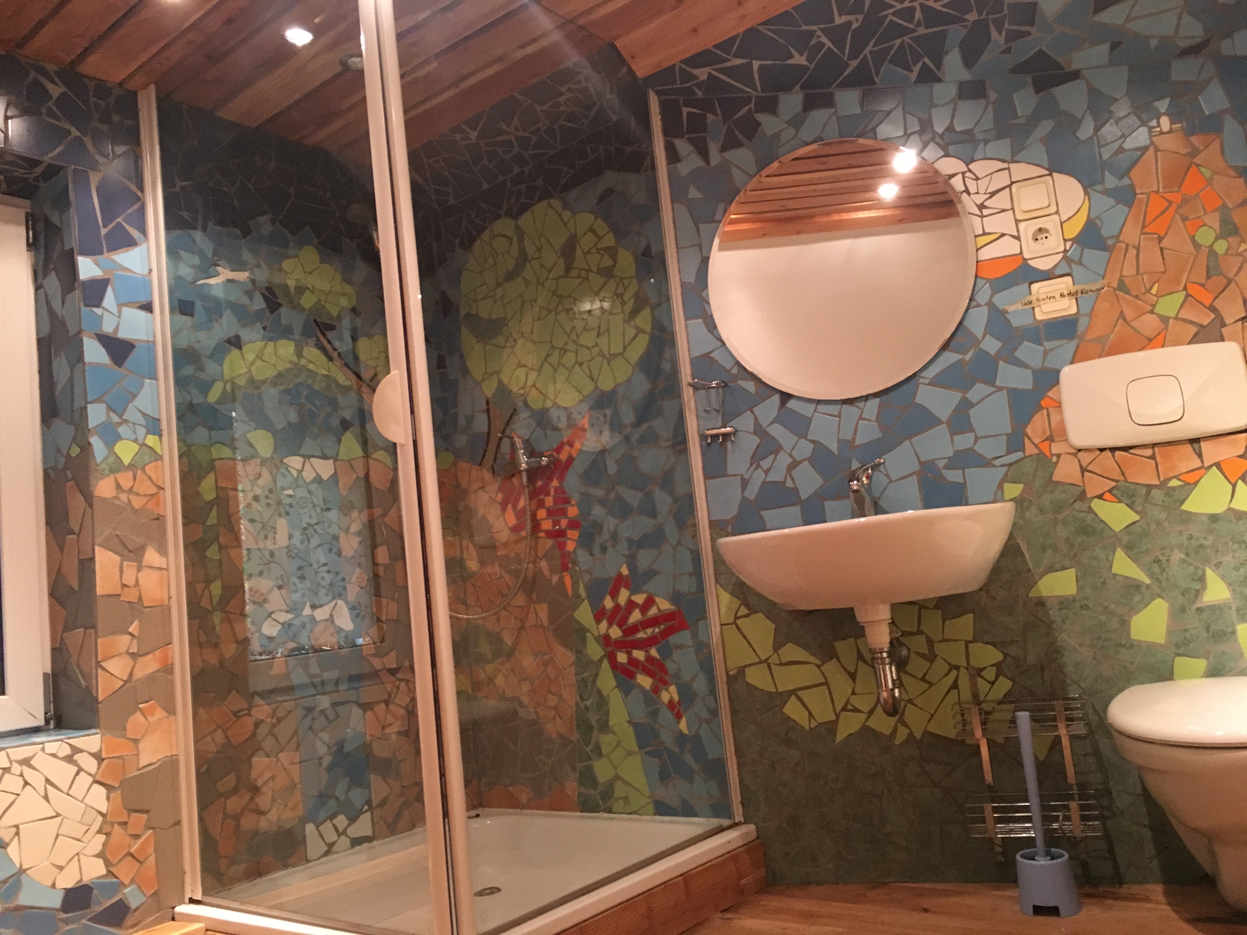 Tenslotte is er een badkamer met toilet, dubbele wastafel en inloopdouche.